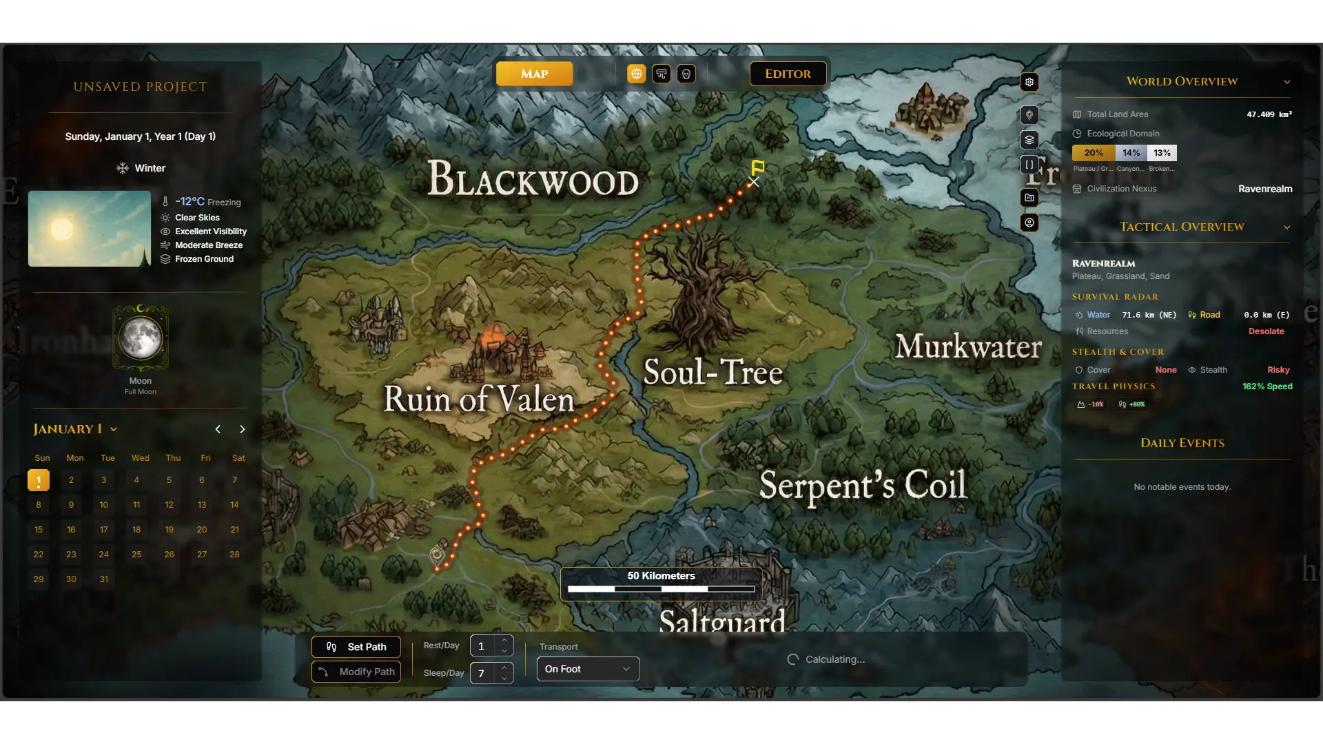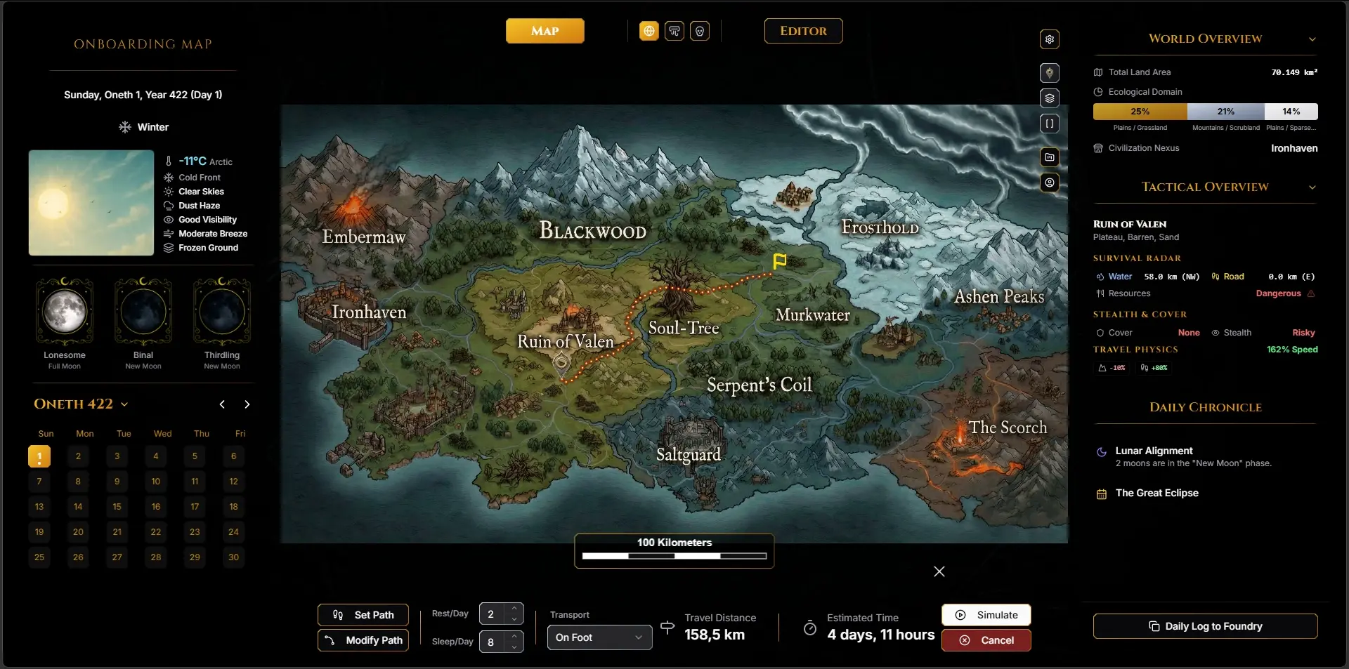 Forget counting hexes. Draw a path and get instant, exact travel times based on terrain friction, road quality, and current weather conditions. The date advances, moons orbit, and seasons shift. Travel is more than distance: math is for computers, storytelling is for you.