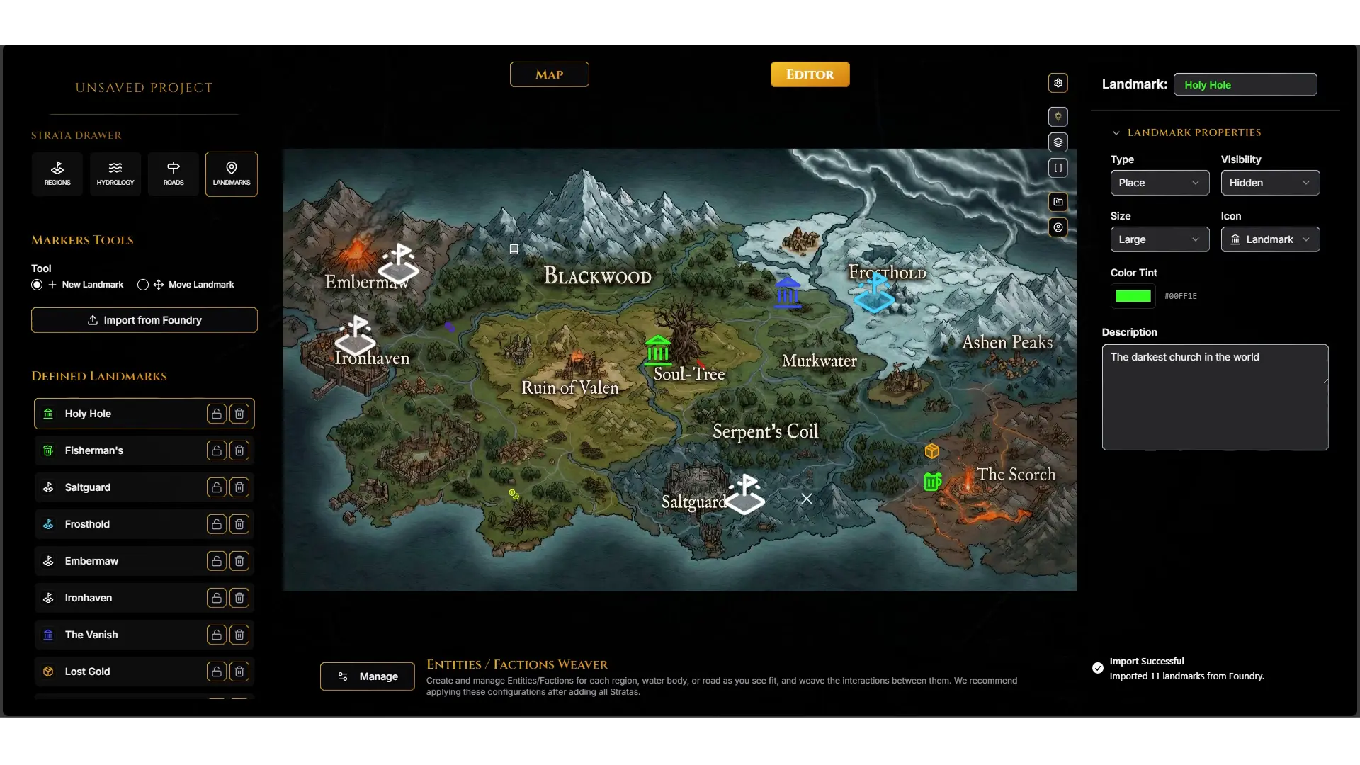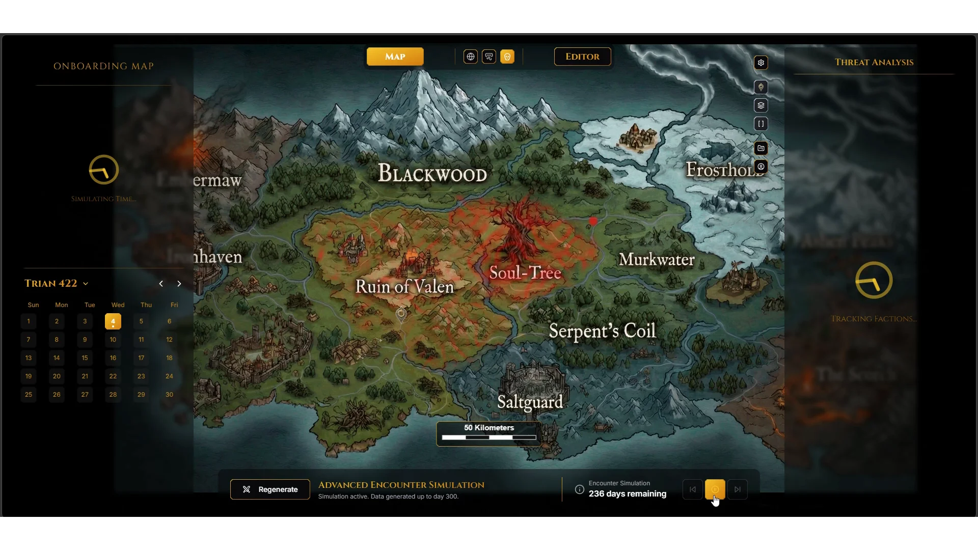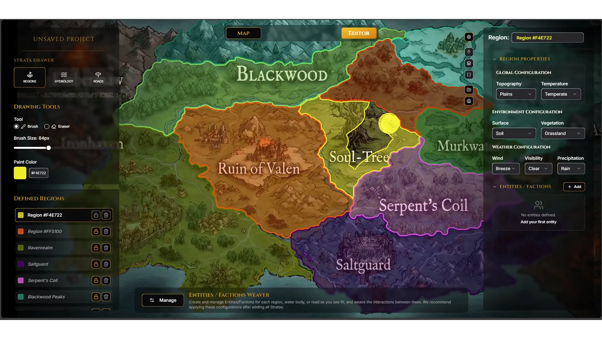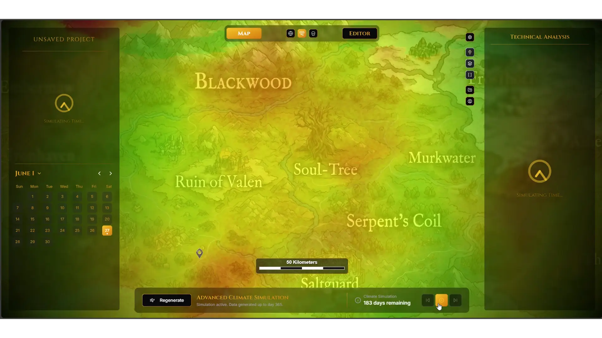 Strata Weaver is not a map-making tool. It is a simulation layer that transforms static maps into living worlds. Imbue your geography with deterministic weather, physics-based travel, dynamic ecosystems, and inspiring events.